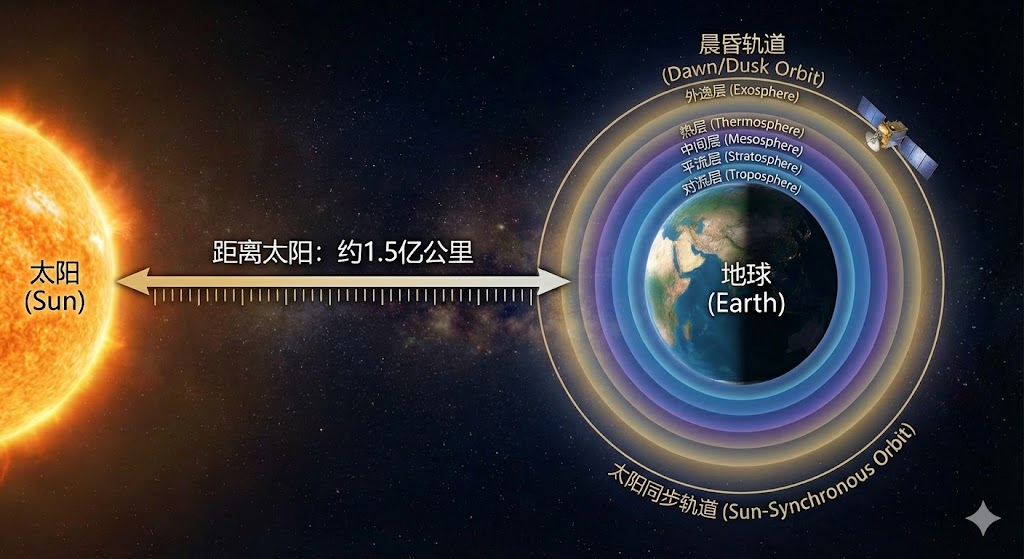 | 太阳同步轨道 | 轨道平面随太阳公转,每天同一时间过同一点,有周期性阴影期(每次约 30 分钟) | 需配备大容量电池,能源供应有波动 | 遥感卫星、低功耗通信卫星 |