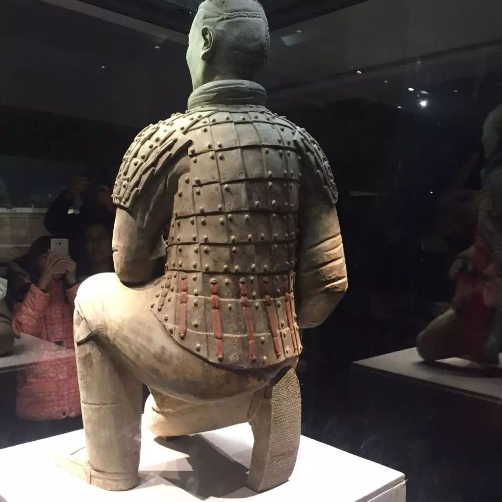 这个跪射俑级别也不高,为什么是镇馆之宝,因为他出土保存的最完整。陕西的旅游标志也是他。可以看到背后的红色条纹也很清晰。