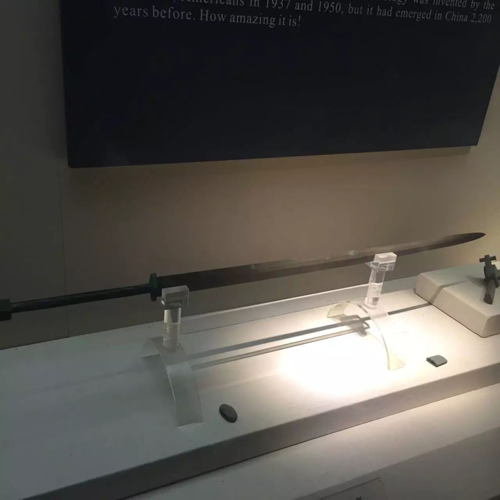 下面的这把宝剑很特别,因为经过了千年竟然完好无损,经过测试还是很锋利的,能砍断几十页报纸。亮点在于为什么没有生锈,青铜其实还是很怕生锈的。