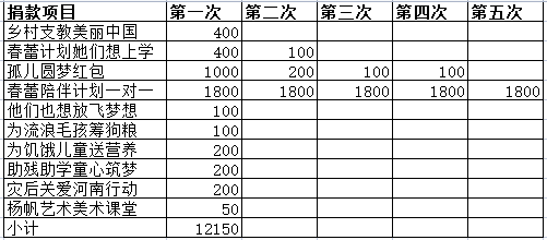 目前的慈善工作主要就是捐款,运动捐步,今年尤其关注的是那些上学有困难和一些孤儿,如下是一些捐款的明细,感兴趣的也可以参与进来,在此不是说有多高尚,只求一个心安。